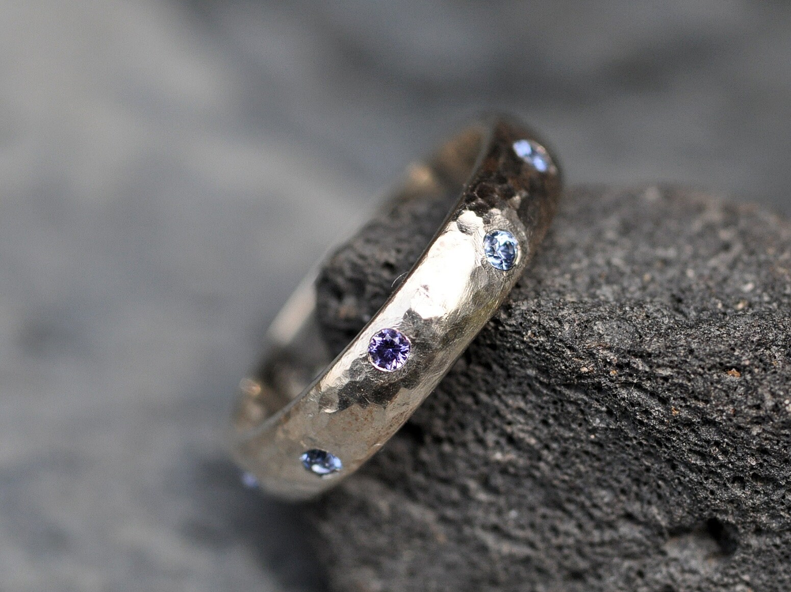 The ring is flush set with ten small Yogo Gulch sapphires. These sapphires are only mined in the Judith Basin area of Montana. They are absolutely gorgeous stones, and are my favourite sapphires. These American sapphires are completely natural and untreated, unlike the vast majority of sapphires. They come in a range of cornflower blues and purple. The rings you see here have a combination of blue and purple Yogos. You may request all of one colour if you prefer.