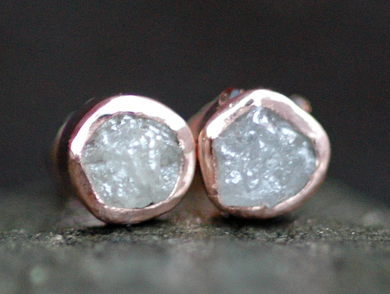 These earrings are built around a well-matched pair of rough diamonds. The diamonds are certified conflict free, and are ethically sourced. The gold is certified recycled.