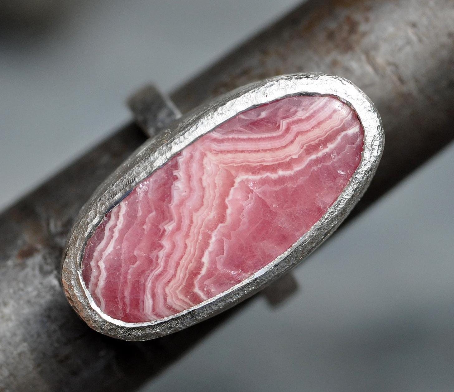 •Pink striped rhodochrosite 27 mm long x 13.8 mm wide x 7.2 mm thick (including bezel setting)