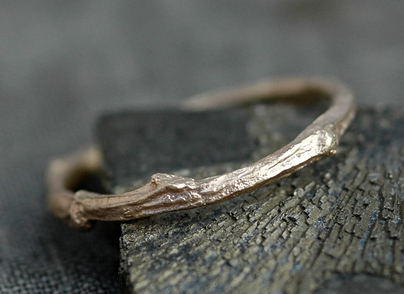 This twig ring is made to order, in your size. I forge these from a casting of an actual branch. The level of surface detail on these is quite amazing- every little ridge, bump, and notch in the original branch is here in its gold counterpart.