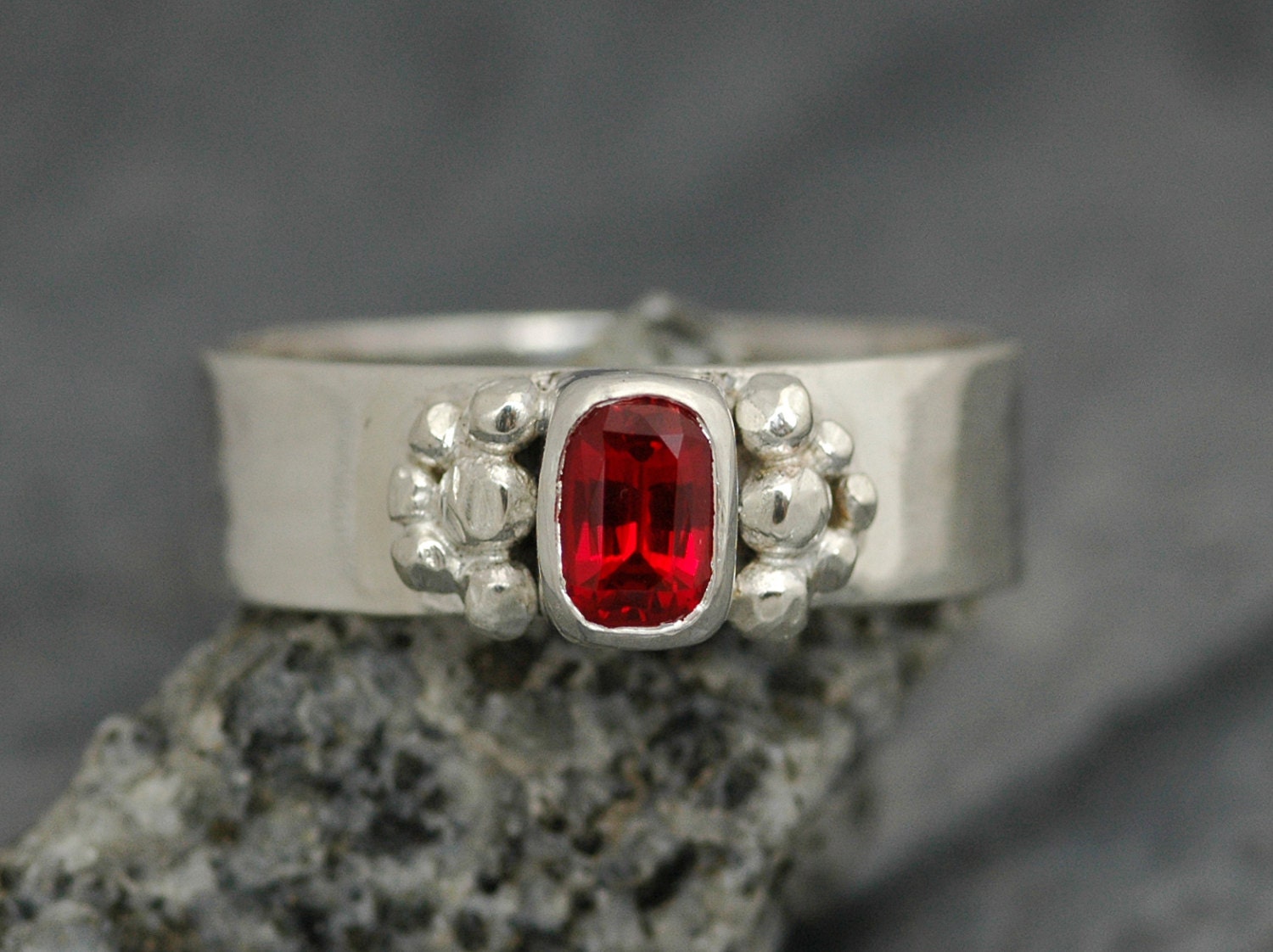 I have set it in a hand-built bezel, on a high-shine sterling silver band. The bezel is complimented with a series of file faceted, geometric granulation.