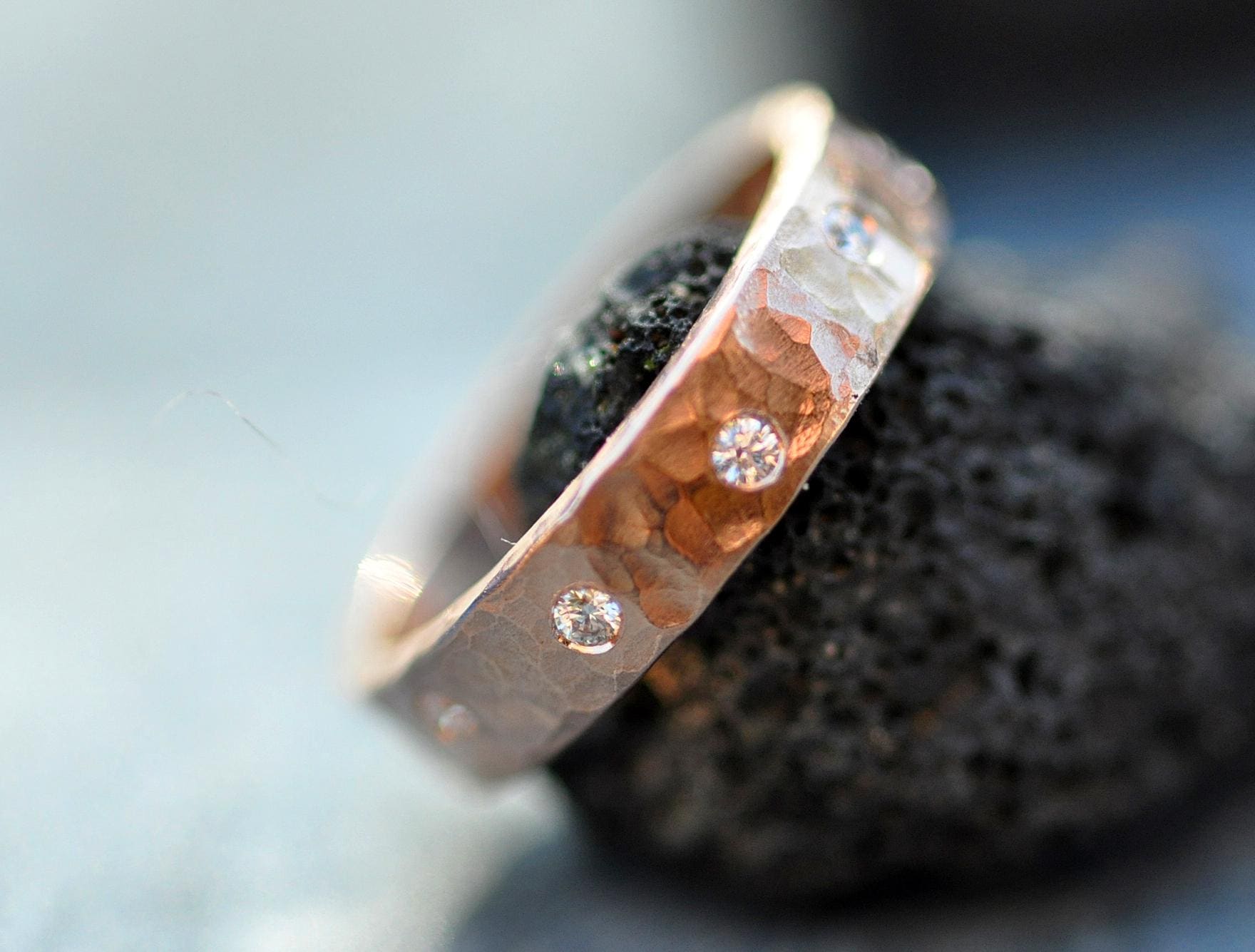 This custom-made engagement/wedding ring is made of solid, 14k recycled rose gold. It is flush-set with ten 1.5mm VS quality white diamonds.